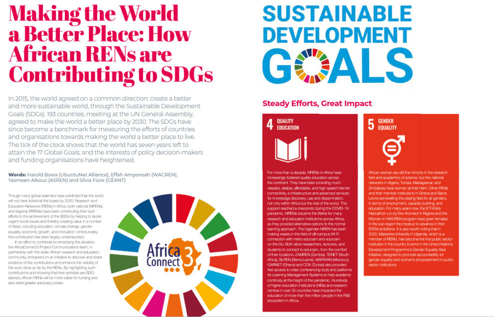 A shorted version of our paper on African RENs’ contributions to the United Nations Sustainable Development Goals has been featured on the latest CONNECT Magazine from GÉANT, CONNECT43, on pages 55-56.