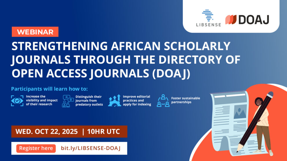 Join the webinar jointly hosted by LIBSENSE and the Directory of Open Access Journals (DOAJ). The Webinar will focus on strengthening African journals through DOAJ. Target audience: researchers, journal editors, publishers, authors, librarians, and scholarly communication stakeholders in Anglophone West and Central Africa.