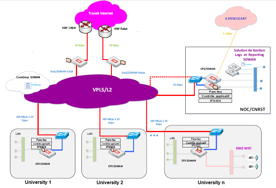 CNRST constantly relies on the evolution of communication technologies internationally to improve the quality, service and network architecture of MARWAN. Today, in its new topology using SD-WAN technology built on the VPN/MPLS telecom operator backbone, MARWAN 5 connects more than 250 higher education and research institutions through 133 links covering 51 cities in Morocco, with a bandwidth speed up to 10 Gbps.